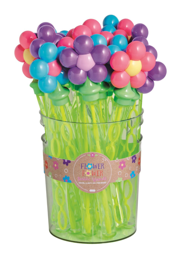 Large flower handle bubble wand. Bubble solution included. Ages 3+. Comes in acrylic display bucket.