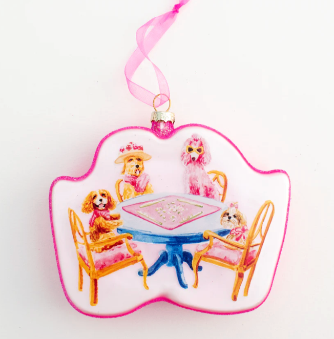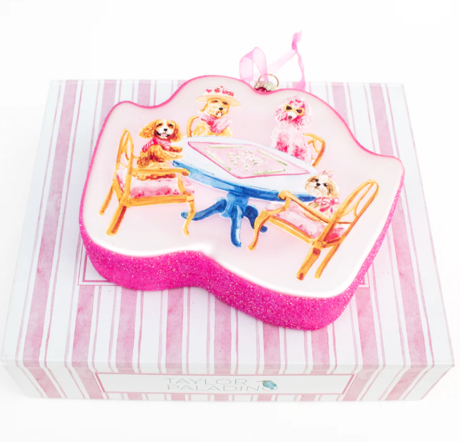 This limited edition glass-blown ornament showcases an exclusive design of dogs playing mahjong by Taylor Paladino. Featuring pink glittered sides and presented in an elegant gift box, it makes for a delightful holiday gift ideal for mahjong enthusiasts. Its unique artistry adds a charming, colorful touch to any holiday décor!