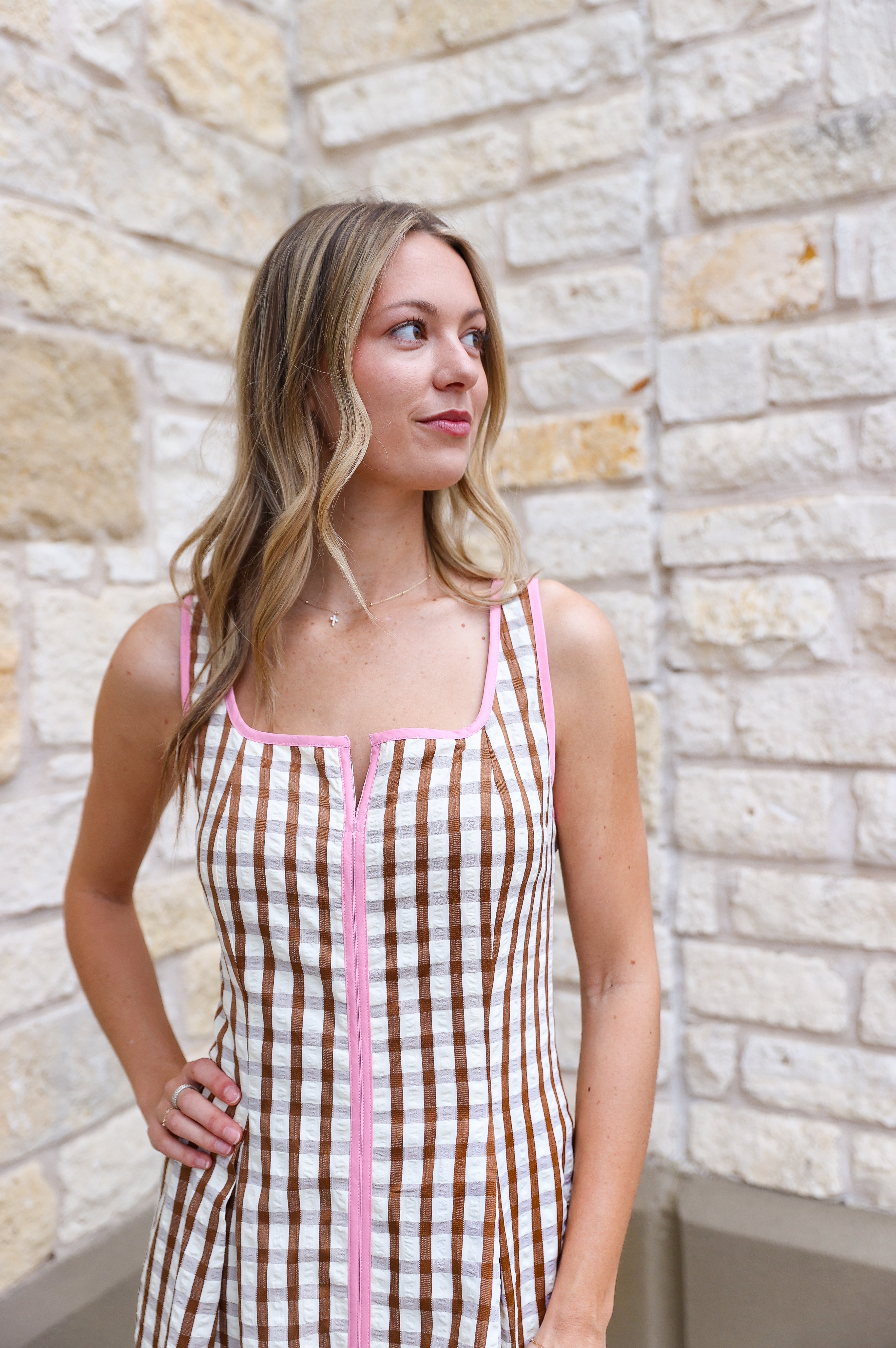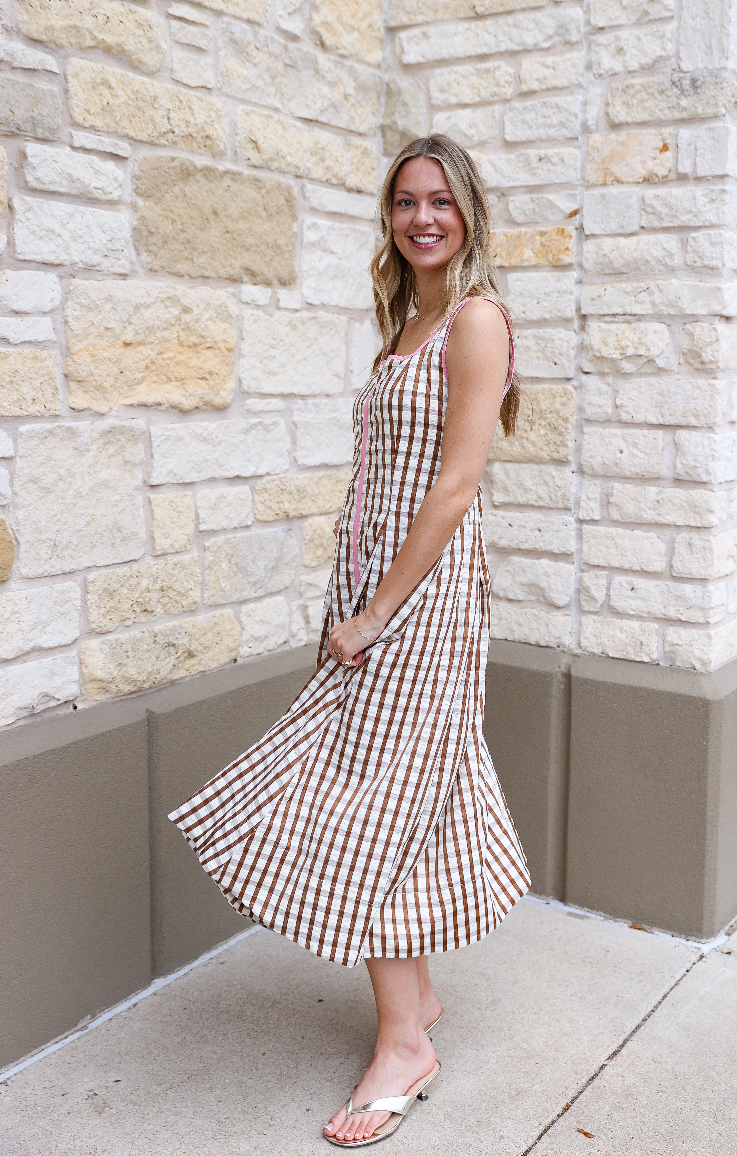 The Darcie Brown Gingham Midi Dress combines timeless style with everyday versatility. Featuring a classic brown gingham pattern, this midi-length dress offers a flattering silhouette perfect for casual outings, brunches, or weekend adventures. The structured fabric provides comfortable wear throughout the day, while the midi cut delivers an elegant, put-together look. A wardrobe essential that transitions seamlessly from season to season.