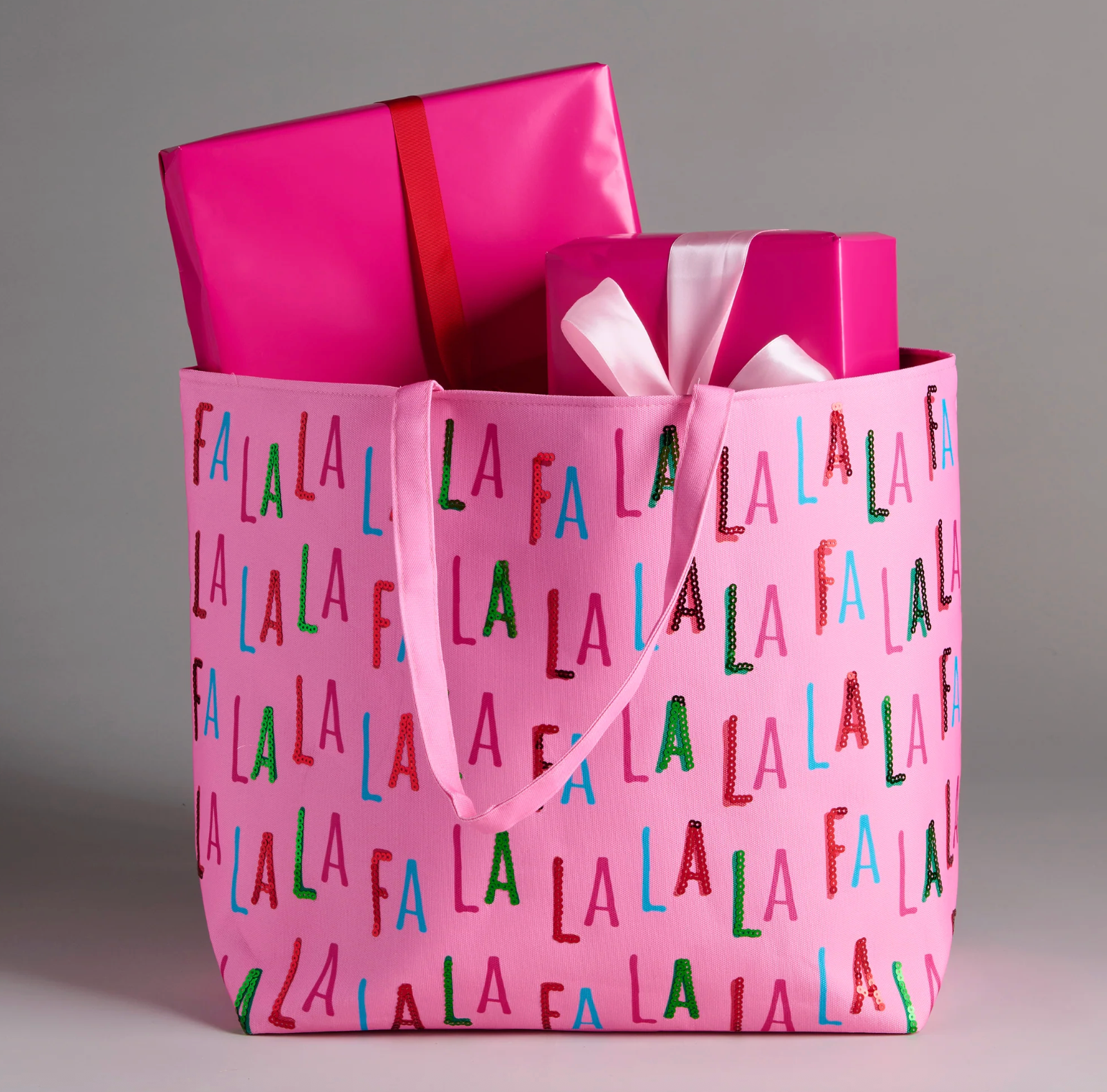 Spread some holiday cheer with the “Fa La La” Gifting Tote, the perfect carryall for all your festive errands and gifting needs. This oversized tote features bold, multicolored “Fa La La” lettering with pops of sequin sparkle for a playful, eye-catching touch. Designed with double shoulder straps and a secure snap closure, it’s roomy enough for presents, party supplies, or a weekend getaway. Whether you're headed to a gift exchange or just running around town, this bag brings the celebration with you.
