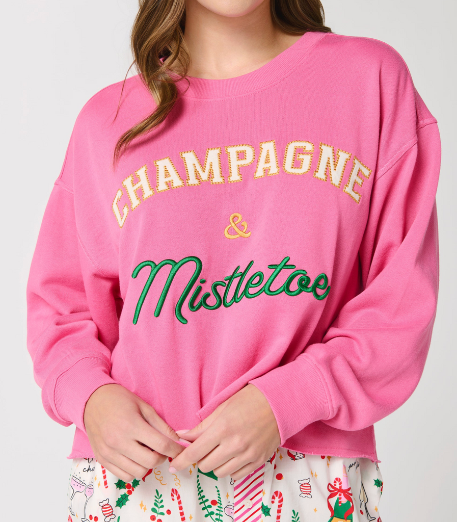 Pop the bubbly and bring on the cozy with our “Champagne & Mistletoe” Lounge Sweatshirt. This festive favorite features a bright pink base and playful text in gold and green embroidery that instantly puts you in the holiday spirit. With its relaxed fit and soft fabric, it’s perfect for sipping, snacking, and snuggling all season long. Pair it with our matching Celebration Boxer Shorts or Celebration Boxer Pants—or mix and match with other merry lounge styles for a full-on festive vibe!