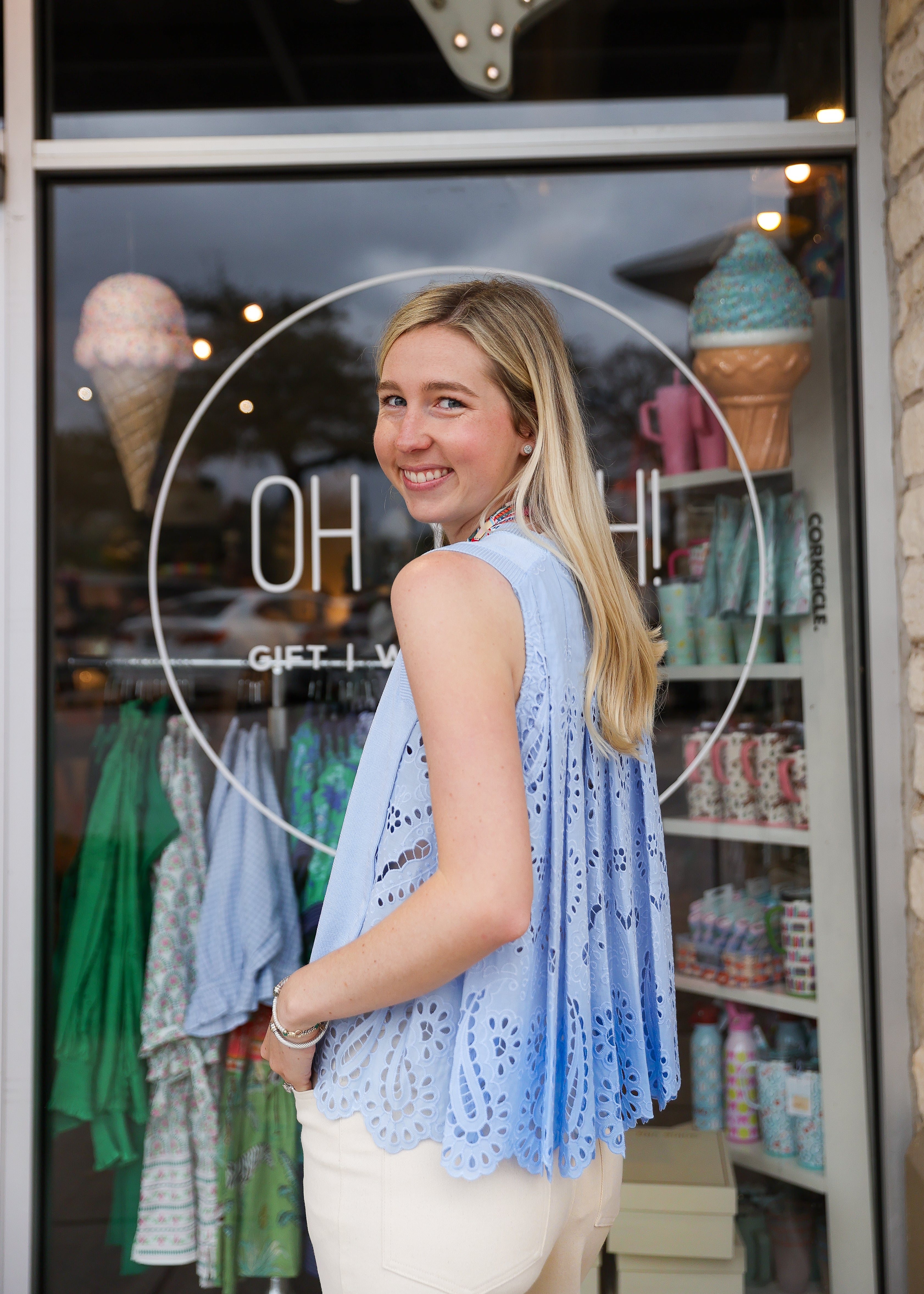 Elevate your warm-weather wardrobe with the Annabel Light Blue Sleeveless Eyelet Top. This breezy piece features delicate eyelet detailing that adds texture and visual interest, while the sleeveless silhouette keeps you cool and comfortable. The soft light blue hue pairs effortlessly with denim, linen pants, or skirts for versatile styling options. Perfect for casual outings, weekend brunches, or layering under jackets during cooler evenings. A timeless essential that brings an airy, feminine touch to any seasonal collection.