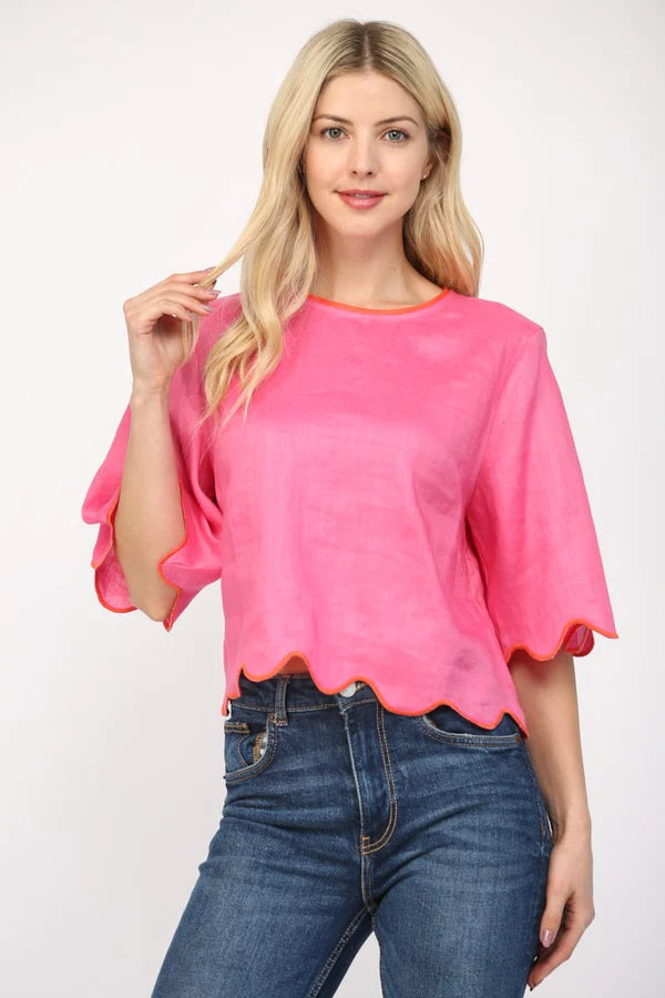 Add a pop of sweetness to your wardrobe with the Myla Candy Pink Scalloped Top. Its charming scalloped edges and vibrant candy pink hue bring a fun, flirty vibe perfect for sunny days and casual outings. Lightweight and comfy, this top makes every moment feel a little brighter and more playful.