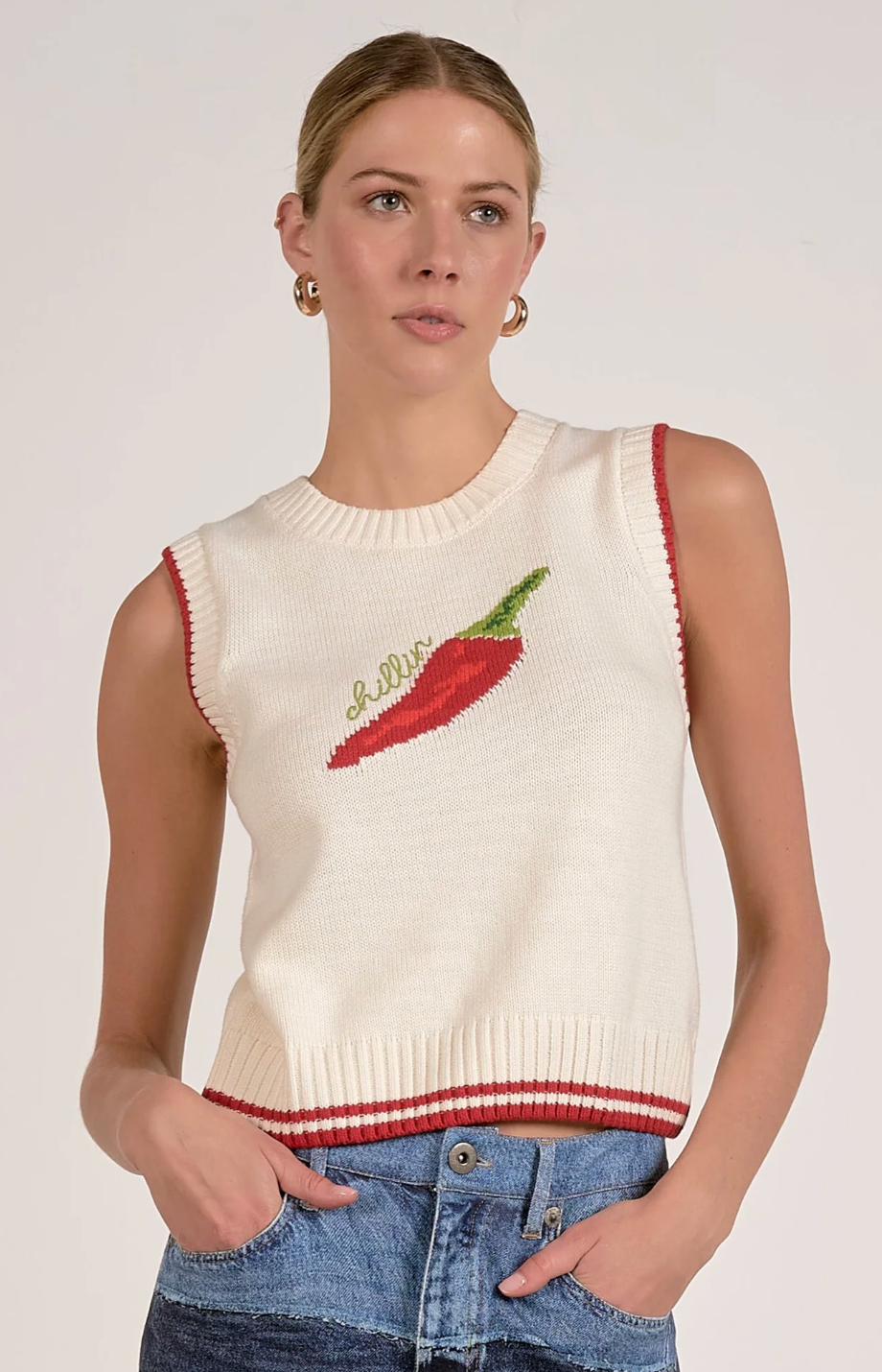 Spice things up with this playful twist on an elevated basic. The Chili sweater tank brings heat with its pepper embroidery and clean, high crew neckline. Crafted in a soft, lightweight sweater knit, this sleeveless silhouette is made to pair with denim, linen, or your favorite statement pant. Slightly cropped for an effortless tuck, it’s an instant conversation starter.