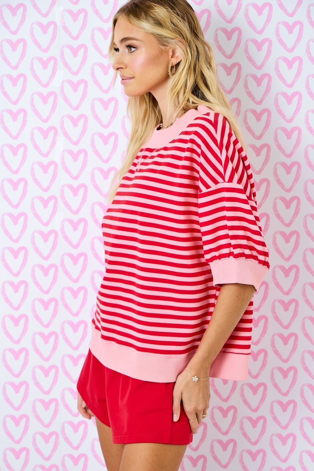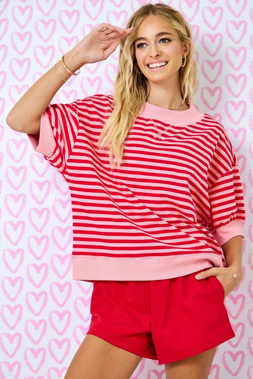 Red & Pink Mock Neck Striped Lounge Sweatshirt with 3/4 Sleeve