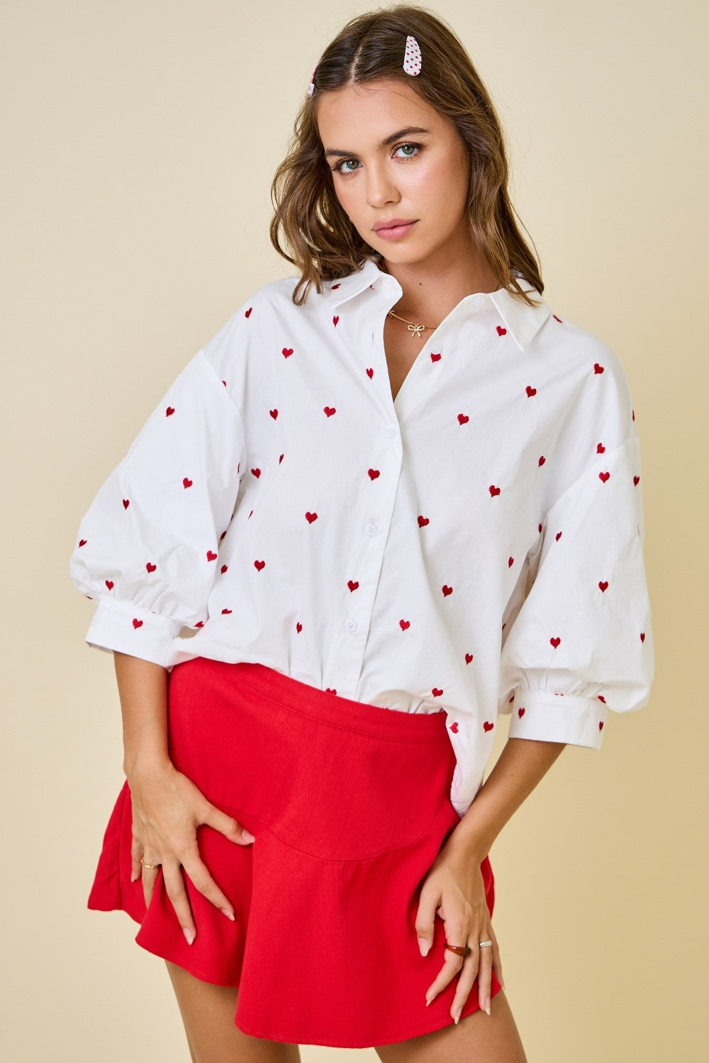 Spread the love this season in our Valentine's Embroidered Hearts Oversized Top! Featuring charming embroidered hearts scattered across a relaxed, oversized silhouette, this piece is perfect for cozy date nights or casual hangouts. The soft fabric drapes beautifully for all-day comfort, while the playful heart details add a touch of romance without trying too hard. Layer it, dress it down, or wear it solo—this versatile top is your new go-to for expressing your sweetest style.
