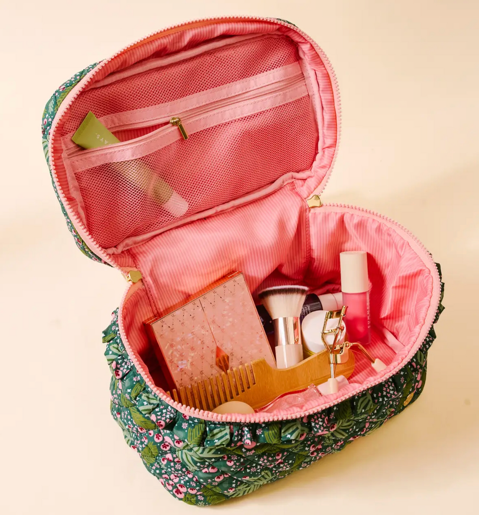 Simplify your routine with our Glam & Go Quilted Cosmetic Bag. Crafted from soft, quilted fabric with a sturdy handle, this bag features an all-around gold double zipper for easy access. Inside, the signature darling wipeable interior lining keeps everything neat and organized. It's perfectly sized to carry your must-haves, whether you're traveling, running errands, or just need a stylish way to keep your essentials in place. Fits every step of your routine Soft, quilted fabric with handle All around gold double zipper Signature darling wipeable interior lining Dims: 11"l x 6"w x 6"h