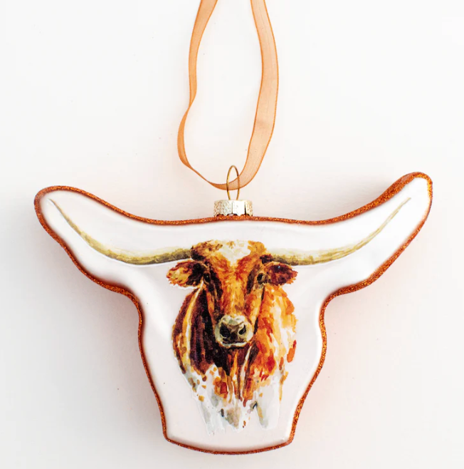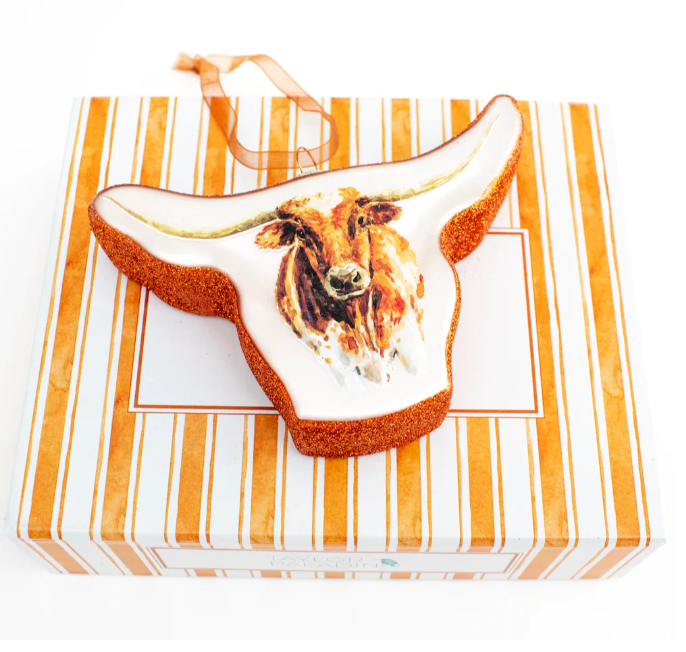 This limited edition glass-blown ornament showcase the fabulous Longhorn Portrait by watercolor artist Taylor Paladino. Featuring burnt orange glittered sides and presented in an elegant gift box, it makes for a delightful holiday gift ideal for longhorn or texan. Its unique artistry adds a charming, Texas touch to any holiday décor!