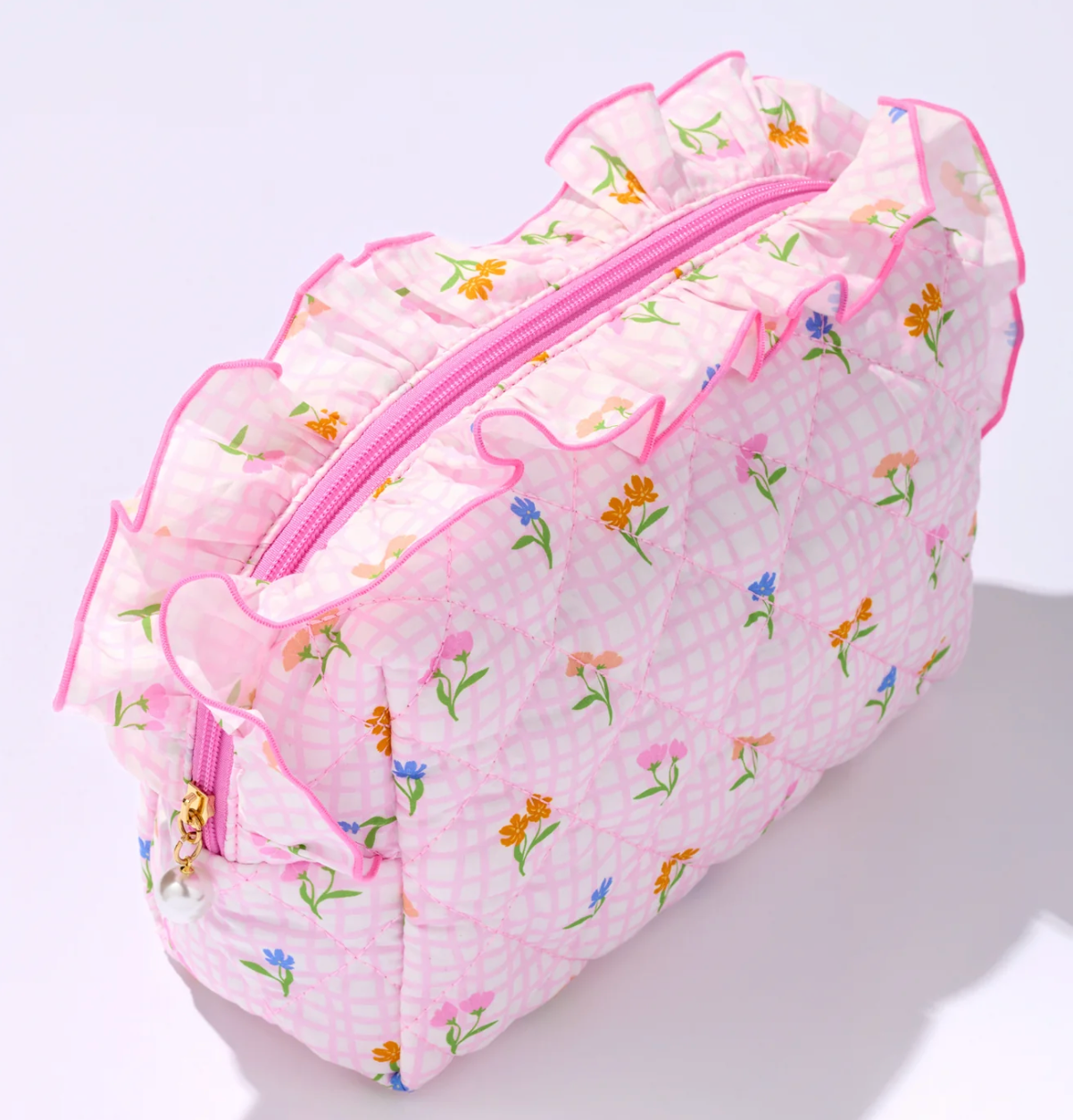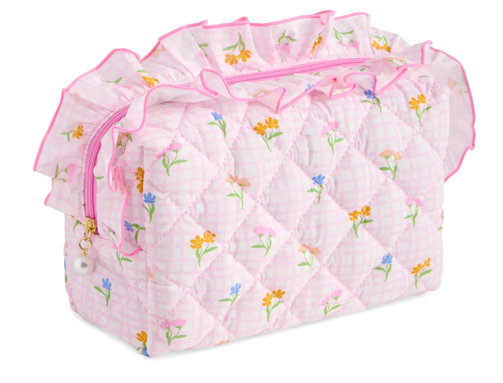 Add a burst of personality to your beauty routine with the Fancy Large Zip Pouch. Designed in playful prints from florals to gingham and stripes, each pouch features a statement ruffle trim and a pearl-accented zipper pull. The quilted texture gives it a soft, padded feel while offering lightweight durability for everyday use or travel. With a top zip closure, it's as functional as it is fabulous.